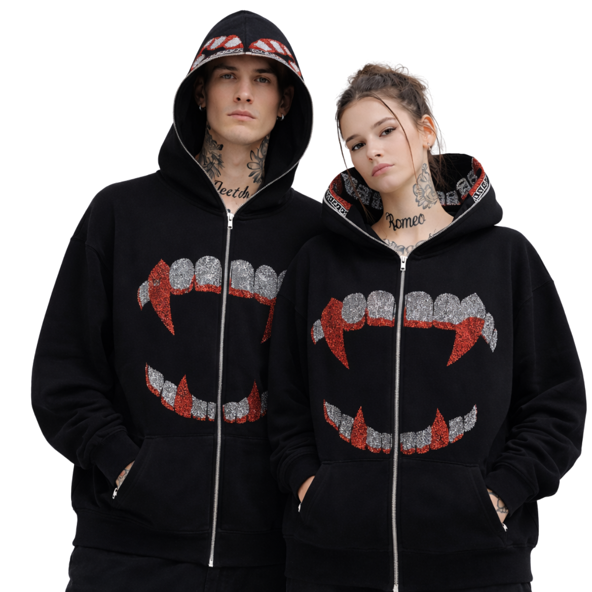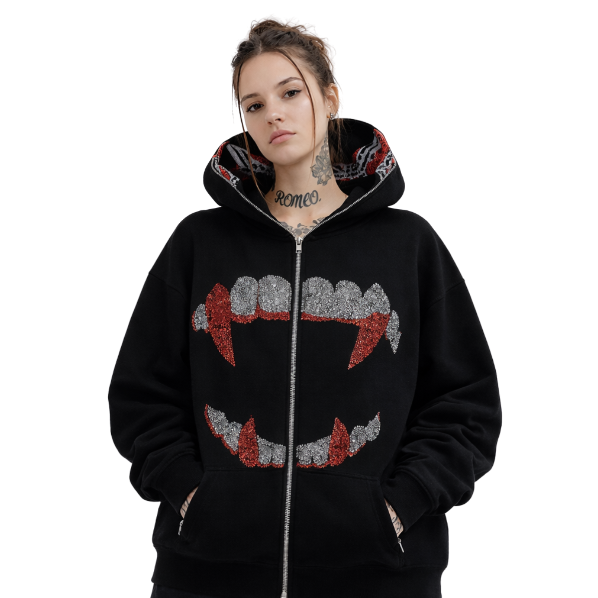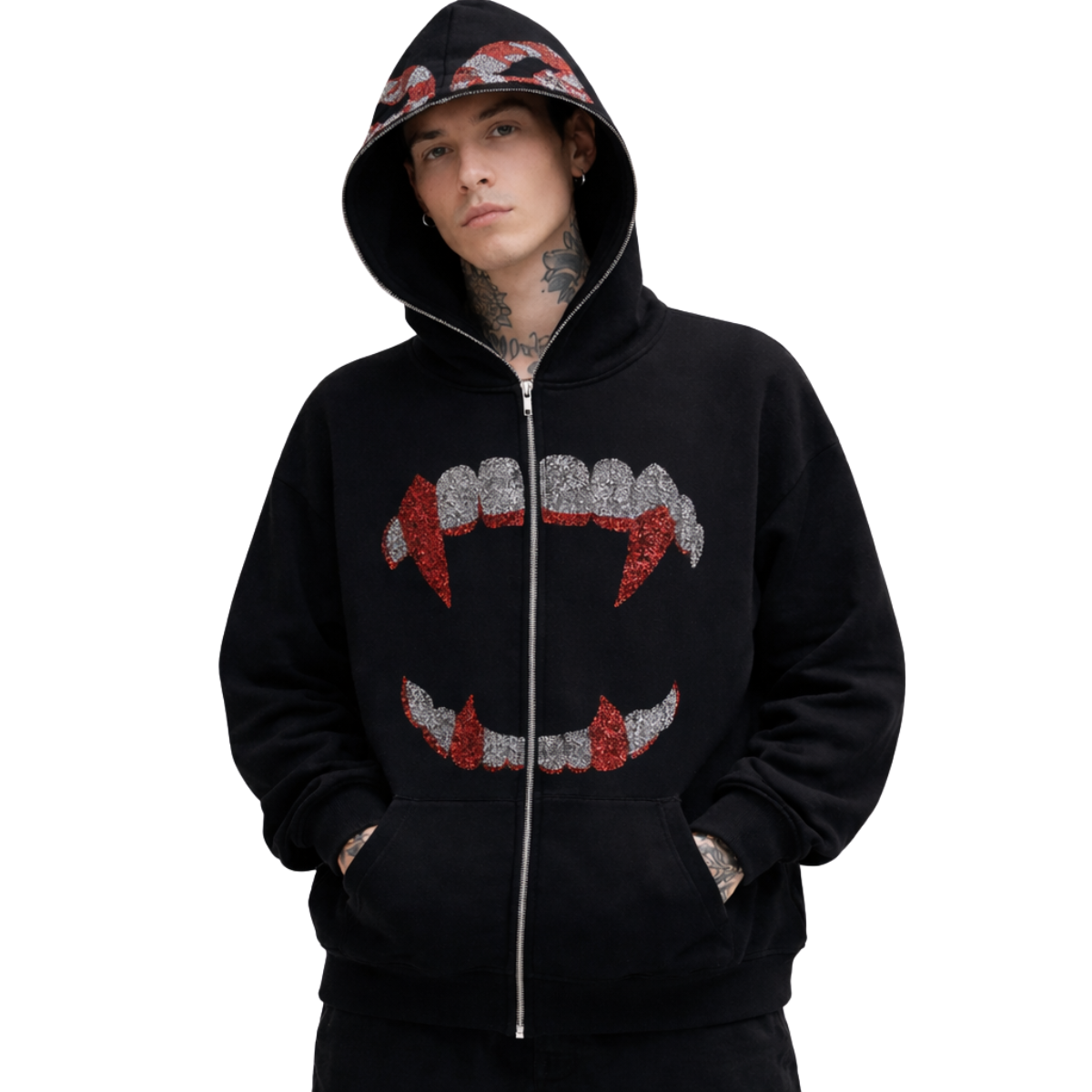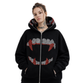 Mit dem Moiré Gothic Strass-Hoodie tauchst du in den Großstadtdschungel ein. Dieser Hoodie ist mehr als nur ein Kleidungsstück – er ist ein klares Statement für Individualität und Streetwear. Entworfen für alle, die die Underground-Szene leben und lieben, vereint dieses Teil edgy Ästhetik mit unvergleichlichem Tragekomfort.