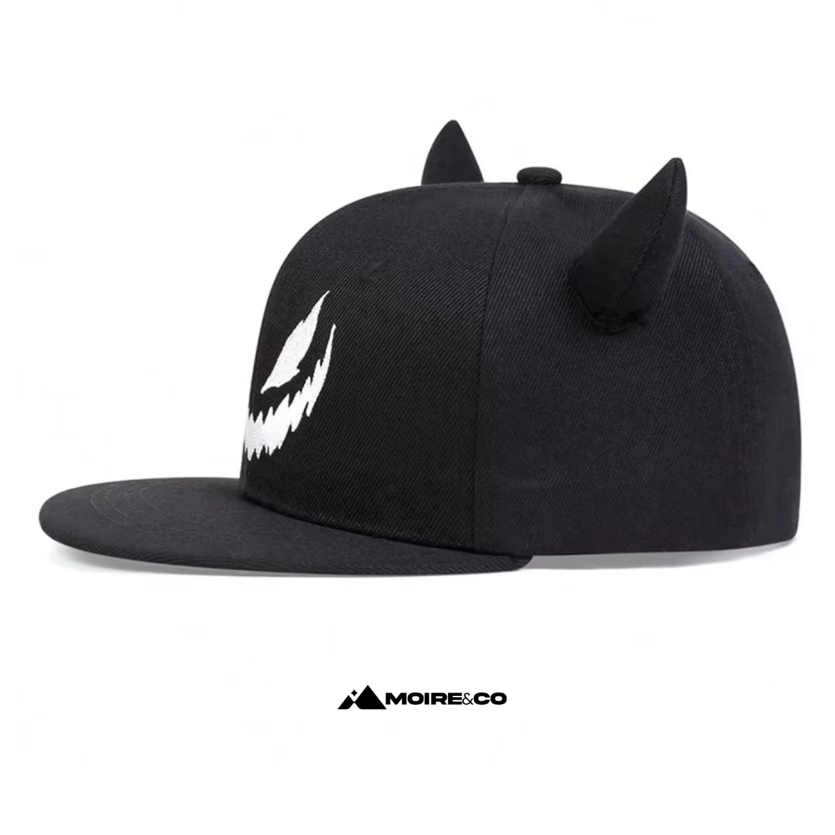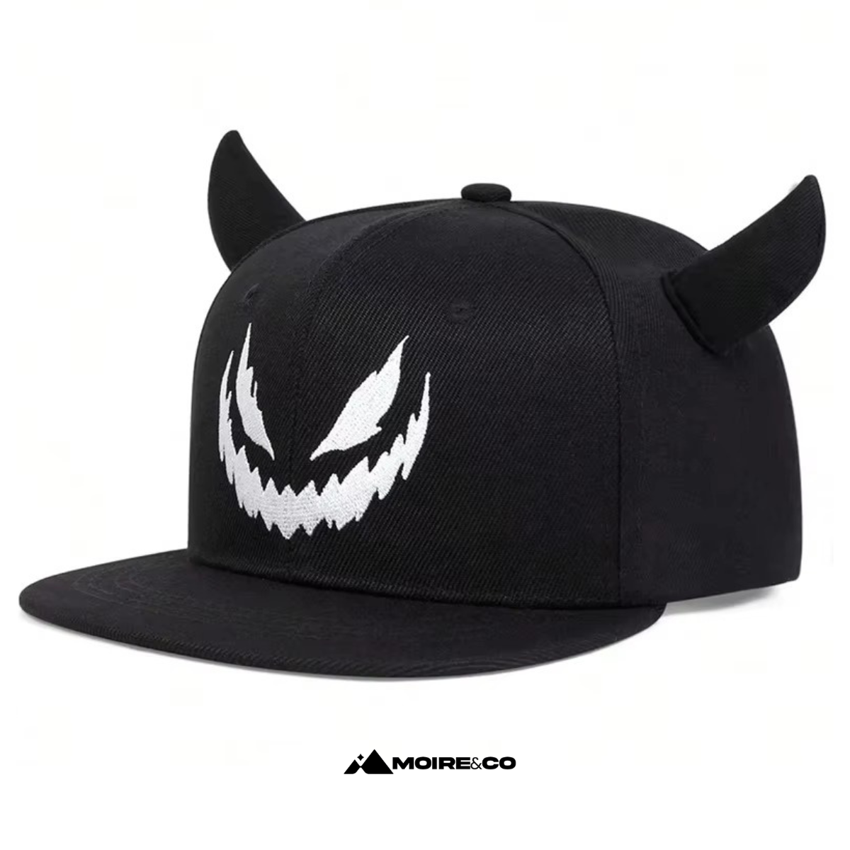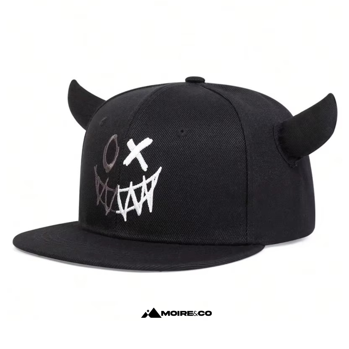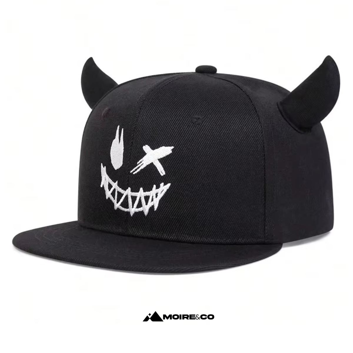 Mit der Moiré Horned Smiley Cap ziehst du alle Blicke auf dich – ein ausdrucksstarkes Statement-Piece, das die Essenz der Streetwear-Kultur verkörpert. Diese Cap ist mehr als nur ein Accessoire; sie ist ein Symbol deines einzigartigen Stils und deiner Attitüde, designt für alle, die die Underground-Szene leben und atmen.